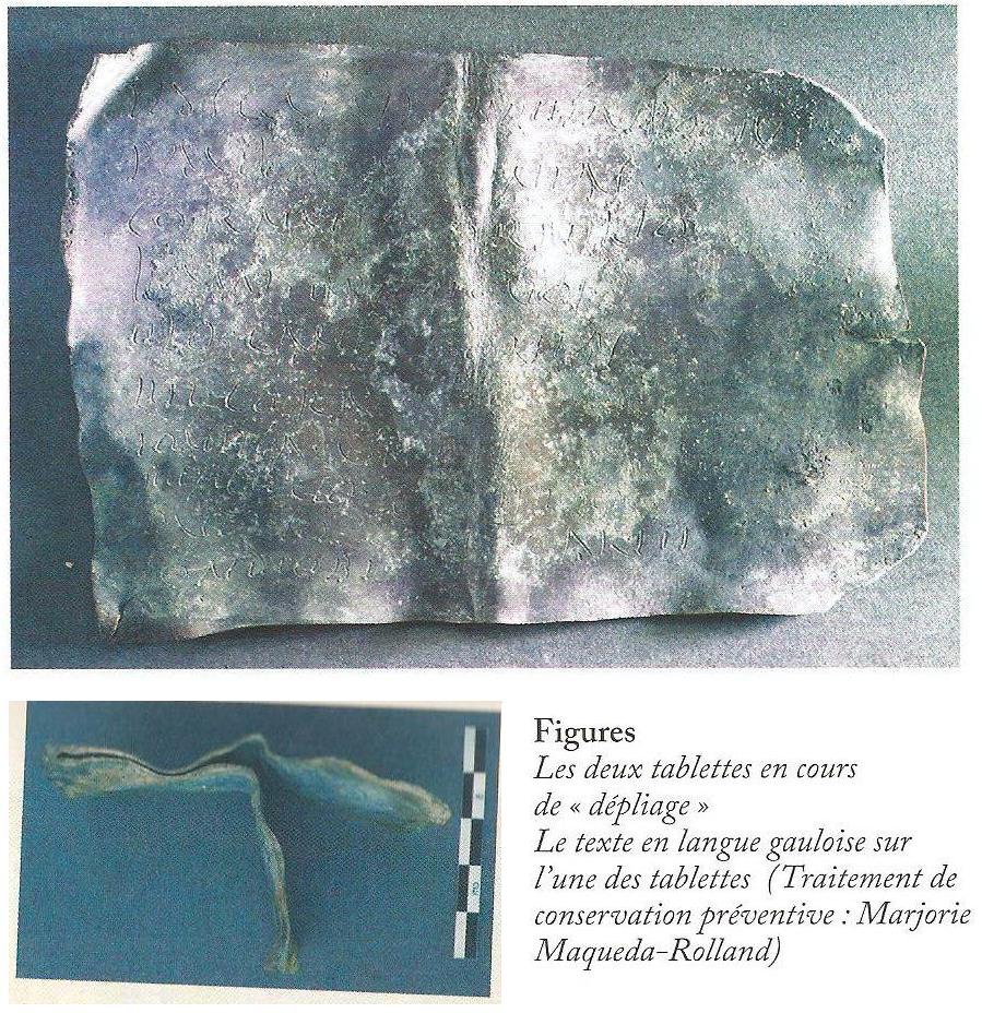 La découverte récente à Chartres de quatre graffitis sur un fragment d'une amphore (les lettres latines A, B, C et D) qui ont été identifiés comme "une leçon d'alphabet recopiée par un enfant sur un fragment de vase" (magazine Chartres Votre Ville n°112 de mai 2012) m'a rappelé que je voulais vous parler depuis quelques temps d'une autre découverte qui me semblait importante : celle d'inscriptions en langue gauloise sur deux tablettes en plomb.