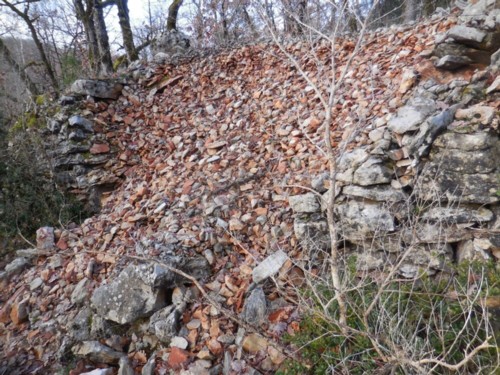 25Sur quelques sites des murs périphériques de terrasse, aménagements connus au Gandus ( Saint-Férréol-Trente-Pas, Drôme) (Daumas, Laudet 1985, 1992), un site de pente dominé par des falaises qui entaille un éboulis (Figure 3) comme pour certains sites préalpins (comme Chamoson, Les Lumères ; Pugin 1986), prennent l’allure, par leur masse plus conséquente, de constructions à vocation plus large. Elles ont été approchées des systèmes de fortification. Ils sont constitués de gros blocs appareillés vers l’aval, disposés pour l’aménagement de surfaces planes en remblais. Dans des contextes topographiques différents, c’est le cas au Cayla de Mailhac (Aude) et au Baou-Roux (Bouc-Bel-Air, Bouches-du-Rhône) (Arcelin, Dedet 1985). A la Jouffe (Montmirat, Gard) le mur de soutien du remblai aménagé sur la pente ouest du site sera conforté par un doublement d’appareils dans la seconde moitié du VIe siècle avant J.-C. Signalons également le cas de Berniquaut (Tarn) où l’on a pu proposer face à l’hypothèse d’une fortification du Bronze final qui avait été avancée (Lautier 1977) et que certains placeraient plus volontiers au Moyen Âge (Carozza 1997), celle possible de la réalisation d’une limite de terrasse artificielle en « bourrelet de pierres » (Seguier 1989).