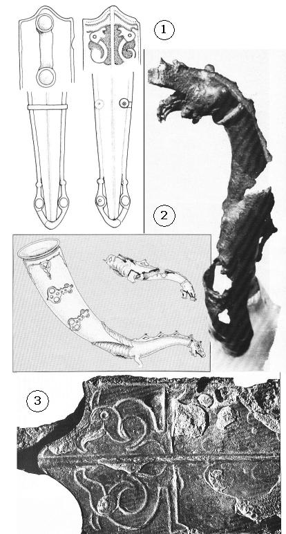 Les griffons de la figure 1 sont les plus anciens, en raison des caractèristiques de la bouterolle et du pontet, nous sommes au début du 4e s av J.C. Je les placerais plutôt dans la catégorie des lyres, mais ils se font faces. Le symbole le plus représentatif est la paire de griffons de la figure 3, l'entré du fourreau couché... Comme il n'y a pas de bouterolle, pas moyen de dater (ce qui est de toute façon déjà daté