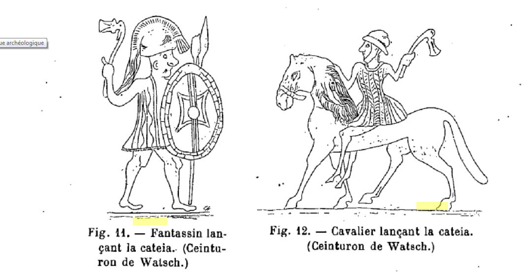 C'est ce que DT avait déjà en partie relayé, non ? ; merci Matrix, ça permet d'avoir une autre approche... Bertrand n'envisage la cateia comme ne pouvant être qu'une hache et tous les textes anciens qu'il cite, ne décrivent à ses yeux qu'un seul et même type d'arme (ce qui nous l'avons vu n'est pas certain). Il est vrai que la cateia (=hache) telle que l'auteur la conçoit, ne peut se confondre avec une hache d'arme ou de jet classique, ce que j'ai essayé de démontrer même si d'aucuns se sont hasardés à la comparer à une sorte de francisque... Ceci étant dit, je pense que Bertrand veut nous convaincre qu'il s'agissait d'une hache "jetable en deux parties" : le manche élastique dont une partie se briserait au moment du lancer, servant à propulser violemment le fer à courte distance. Il est probable qu'en s'exerçant bien, et à condition de ne rencontrer aucun obstacle, c'est-à-dire hors conditions de combat, un lanceur habile pouvait sans doute voir le fer revenir vers lui, suivant l'angle de jet initial... :?: + :!: