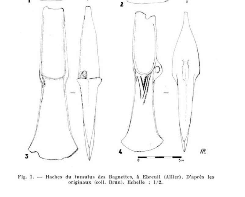 * découverte de haches dans le tumulus des Bagnette à Ebreuil (Allier) dont une hache munie d' anneau (?)