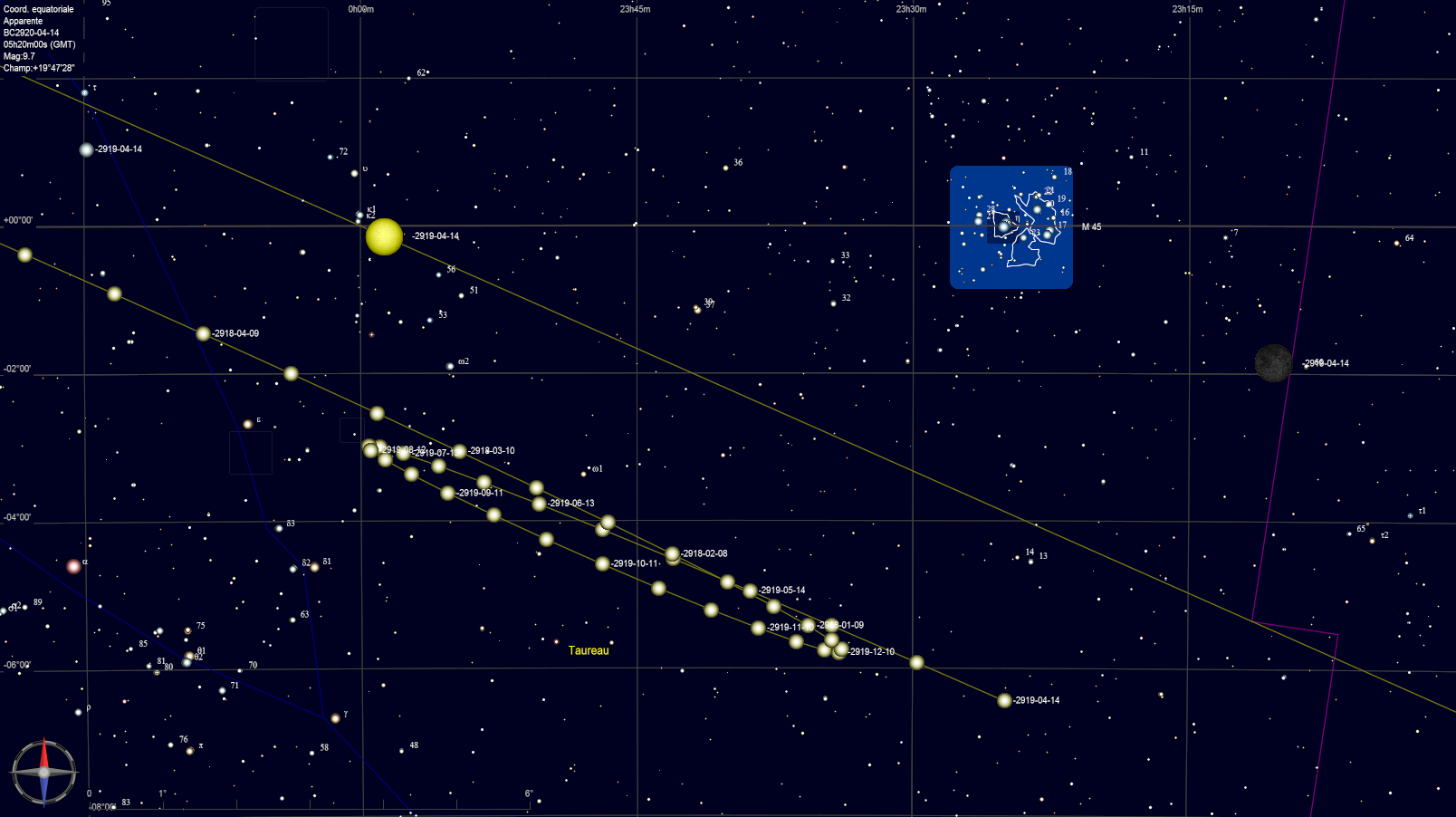 @Gérard et @tous: je n'affirme rien dans ces posts, il s'agit d'une solution possible ... @Séléné : - Les astres qui se lèvent et se couchent respectivement pile à l'Est et à l'Ouest, sont ceux qui sont situés sur l'équateur céleste (projection de l'équateur de la Terre dans l'espace). Autrement dit pour un habitué, ceux dont la déclinaison apparente est nulle. Rechercher la date où les Pléiades (ou Messier 45) se lèvent pile à l'Est revient à rechercher la date où la déclinaison apparente de M45 est nulle. L'équinoxe de Printemps est le moment où la déclinaison apparente du Soleil devient nulle en passant de l'hémisphère Sud vers le Nord. C'est dans le sens Nord vers Sud pour l'équinoxe d'automne. A l'aide du logiciel Skychart, j'ai donc recherché la période avant -3000 où l'on peut considérer que les Pléiades étaient sur l'équateur céleste compte tenu de l'effet de la précession. Elles sont petites mais étendues donc je me suis arrêté au moment où l'équateur céleste passe par le milieu de l'amas soit vers l'an -2920. On peut considérer que M45 traverse l'équateur céleste de l'an -3000 à l'an -2870 soit sur environ une période de 130 ans comme solution possible à notre problème. Comme nous avons aussi discuté de Saturne dans le Taureau tous les 30 ans pour le problème Coligny, j'ai recherché une date dans ces 130 ans où Saturne était effectivement dans le Taureau. On tombe en l'an -2920. Et pour que le Soleil soit aussi sur l'équateur céleste au Printemps, on est alors le 14/04/-2920 JULIEN (soit le 21/03/-2919 GREGORIEN), 30 minutes avant le lever du Soleil à 05h20 UT pour pouvoir observer cette configuration céleste : Sur cette image rendue par SkyChart, vous visualisez : - les lignes horizontales qui sont la graduation de la Déclinaison céleste apparente. Sur la gauche delta=00°00' correspond à la déclinaison nulle donc l'équateur céleste. Vous trouvez le Soleil (disque jaune) juste en dessous car il passera l'équateur céleste durant la journée (hémisphère Sud vers hémisphère Nord). Le sonnocingos (l'écliptique, son trajet annuel devant les étoiles lointaines en fond) est la ligne jaune en diagonale ; - les lignes verticales qui sont la graduation de l'Ascension Droite apparente des astres. Vous avez le Soleil à 0h (normal puisque équinoxe de Printemps) et sur la droite les Pléiades M45 à alpha=23h20m ; - la Lune nous fait la surprise d'être à proximité dans un très fin croissant juste avant la nouvelle lune, sans doute à la grande limite de visibilité, le plus fin croissant avant la nouvelle lune ; - enfin Saturne et la boucle de rétrogradation représentée sur le bas, en plein dans le Taureau ; Vous remarquerez comme moi que cette simulation contient les astres du disque de Nebra avec la Lune, le Soleil, les Pléiades "placés de la même manière" : Mais attention ! si on postule que le disque en or est le Soleil, alors le croissant Lunaire n'est pas correctement orienté. Il est impossible d'avoir la Lune à l'Ouest du Soleil avec le croissant orienté à l'Ouest. Le croissant lumineux est forcément en regard du Soleil dont il reçoit la lumière. Soit l'artiste s'est trompé, soit le disque ne représente pas le Soleil mais alors la pleine Lune ? Nous serions alors dans le symbolique de la période entre le croissant (représenté d'une forme après la NL) et la Pleine Lune ? David.