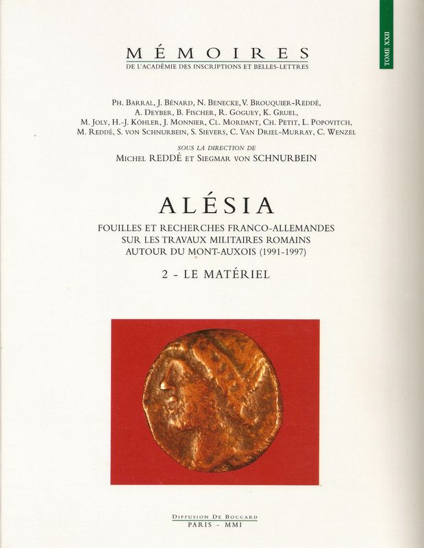 Tome XXII.Alésia.Fouilles et recherches franco-allemandes sur les travaux militaires romains autour du Mont-Auxois (1991- 1997) sous la direction de REDDÉ (M.) et SCHNURBEIN (S.von).Ouvrage en 3 vol.: 1-Les fouilles XVI-576 p.,298 fig 22 pl.h.t.dont 3 en coul.,1 CD Rom. 2-Le matériel 390 p.,25 fig.,116 pl. 3-pochette contenant 19 pl.en dépliant,2001.