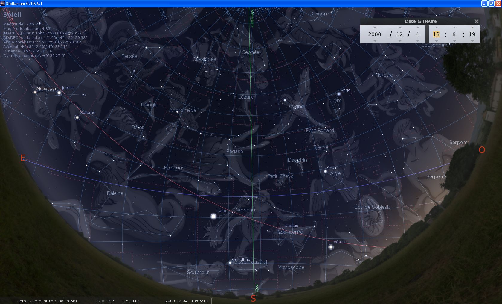 Re: Le sanctuaire Arverne de Corent et l’Astronomie ?Voici un exemple de rendu pour le "siècle gaulois" (?) hypothétique de l'an 2000 pour le 04/12/2000 à 18h04, au Premier Quartier réalisé la nuit d'avant vers 4h, après que le Soleil se soit couché, au crépuscule nautique (h < -12°, on voit largement les étoiles les plus fortes mais l'horizon Ouest proche du Soleil est lumineux). Sur l'Est, on pouvait observer en train de se lever: le Taureau avec Saturne qui l'avait pénétré quelques jours auparavant. La Lune en PQ + quelques heures était presque au méridien.
