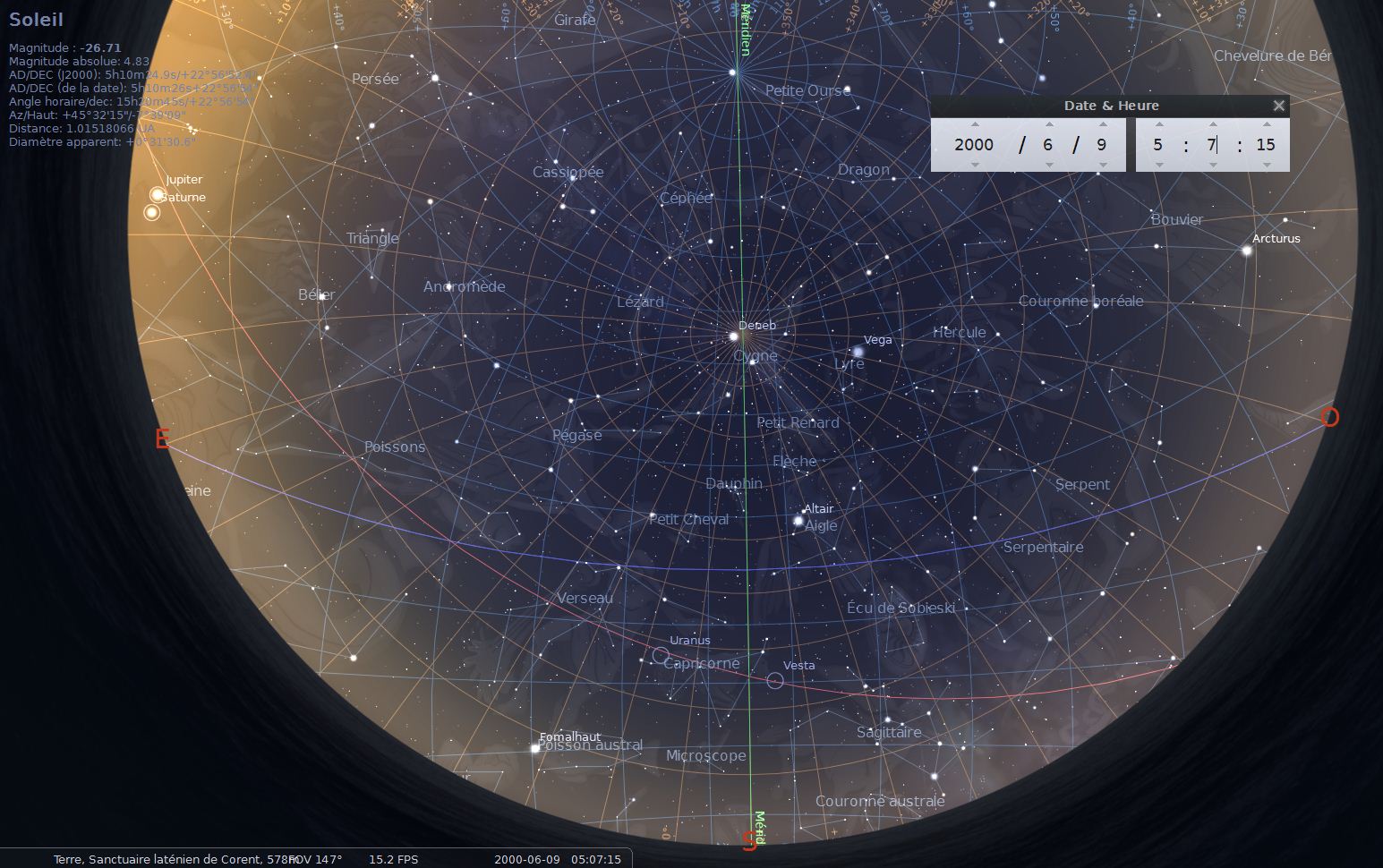 Re: Le sanctuaire Arverne de Corent et l’Astronomie ?Voici une autre simulation du ciel grâce au logiciel "Carte du Ciel / SkyChart", pour l’occurrence du 30/10/-150 . L'auteur du logiciel (Patrick Chevalley) a gentiment amélioré la précision des calculs pour l'antiquité suite à plusieurs échanges avec moi cette dernière semaine (modèle de précession valable sur 200.000 ans selon une méthode publiée en août dernier par le SYRTE-Observatoire de Paris, meilleure approximation de la quantité DeltaT=TT-UT1 irrégularités de rotation de la Terre).