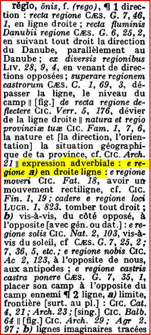 Jibé, même dans le Gaffiot que vous citez, la locution adverbiale "e regione" signifie "en droite ligne"!