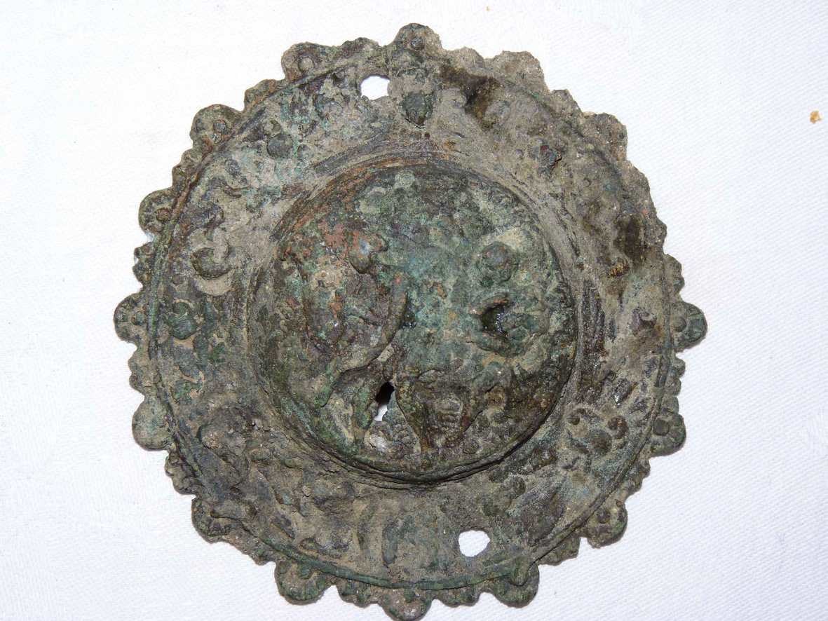 il est doté de seulement deux trous de fixation et représente une scène champêtre avec a gauche un homme (en érection) maniant une faux? Et une sorte de tuberculeuse entre les jambes et a droite une femme assise avec un bébé dans les bras. La frise extérieure est ornée de petites gravure avec notamment a droite un casques croisant un sabre courbé.