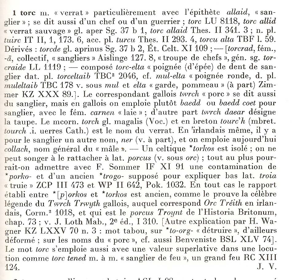 le dico étymologique du Breton rapproche les mots suivants : TURKOS = Sanglier/Verrat comme une contraction de TO-ORKOS TO-ORKOS = littéralement = le fait de creuser = celui qui creuse [avec son groin] = le cochon vous confirmer ? Allez, va... Jacte à l'Est