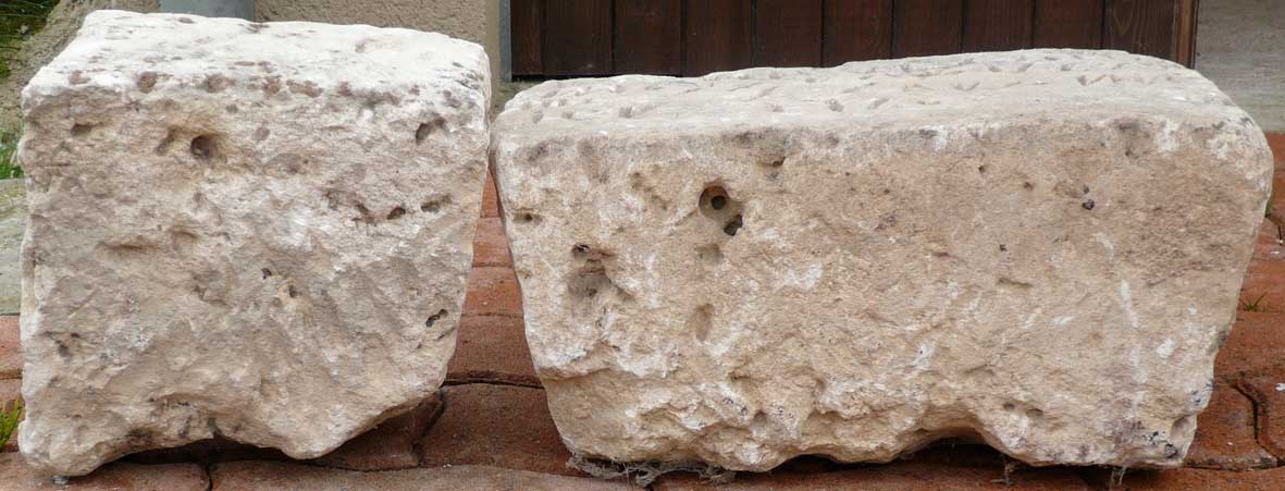 Près de cette pierre a été repéré cette autre, de même nature, de même angle de taille, mais de profondeur différente, et qui avait été retaillée sur deux faces. La face supérieure, de même aspect de surface que celle portant inscription est dépourvue de tout signe. Sur la photo, la pierre avec inscriptions est celle de droite. J'ai examiné les environs des bâtiments de l'ex-ferme d'où vient cette pierre gravée. Il y a un nombre impressionnant (fait unique pour la région) de pierres calcaire de toutes tailles taillées pour la construction. La pierre gravée est l'une des plus petites, certaines font environ un mètre cinquante de long, d'autres font jusqu'à deux mètres de long, environ un mètre de large et trente cm d'épaisseur. Elles doivent peser entre une et deux tonnes chacune. Elles sont disposées en remblais pour tenir les bords de la mare. Le profil de leur taille fait penser à des sablières monumentales. Pomatium